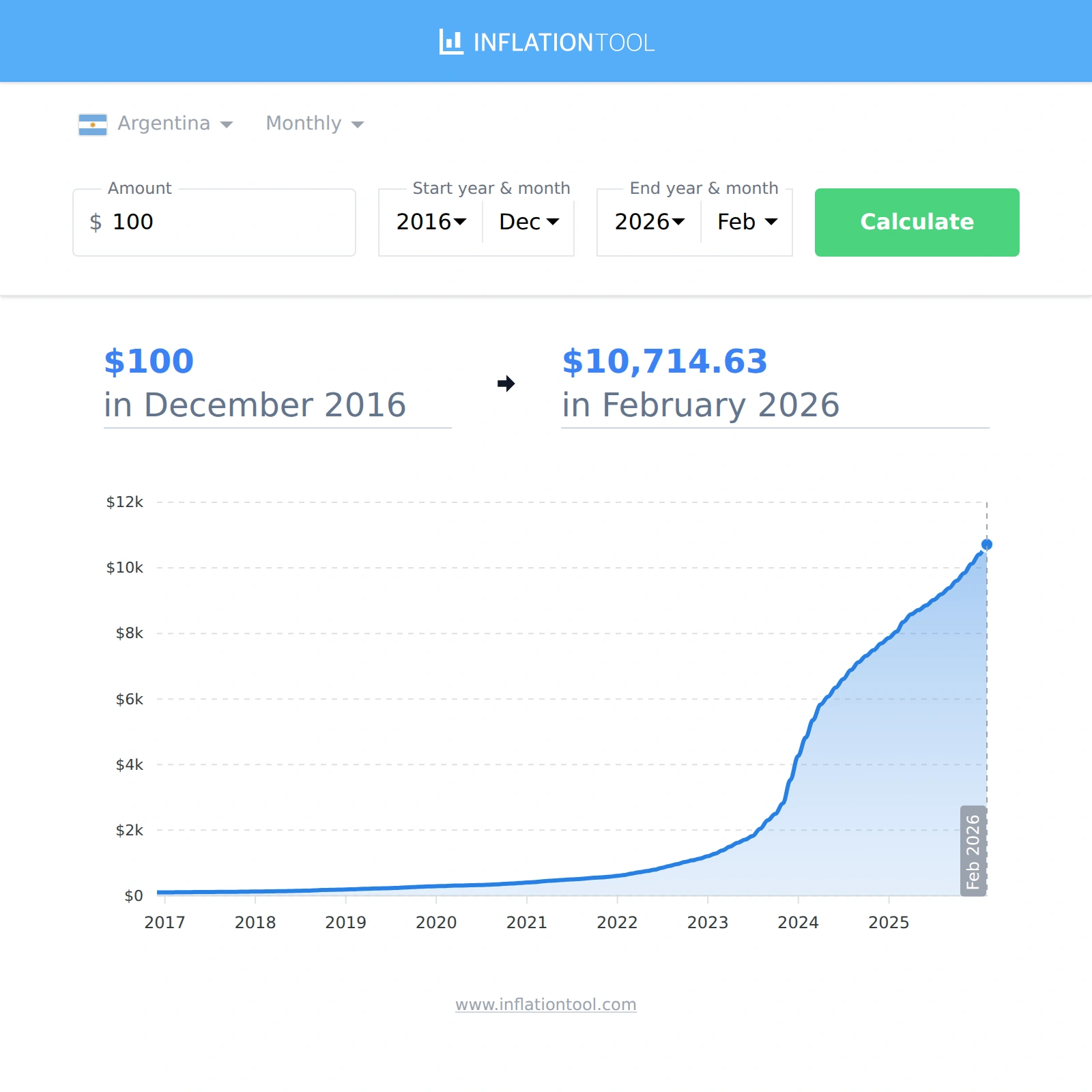 The cumulative inflation rate in Argentina between December 2016 and February 2026 was 10,614.63%, meaning that overall prices were 107.1 times higher than they were in December 2016. In other words, the purchasing power of $100 in Dec 2016 was equivalent to $10,714.63 in Feb 2026. The average annual inflation rate over this period was 4.34%.