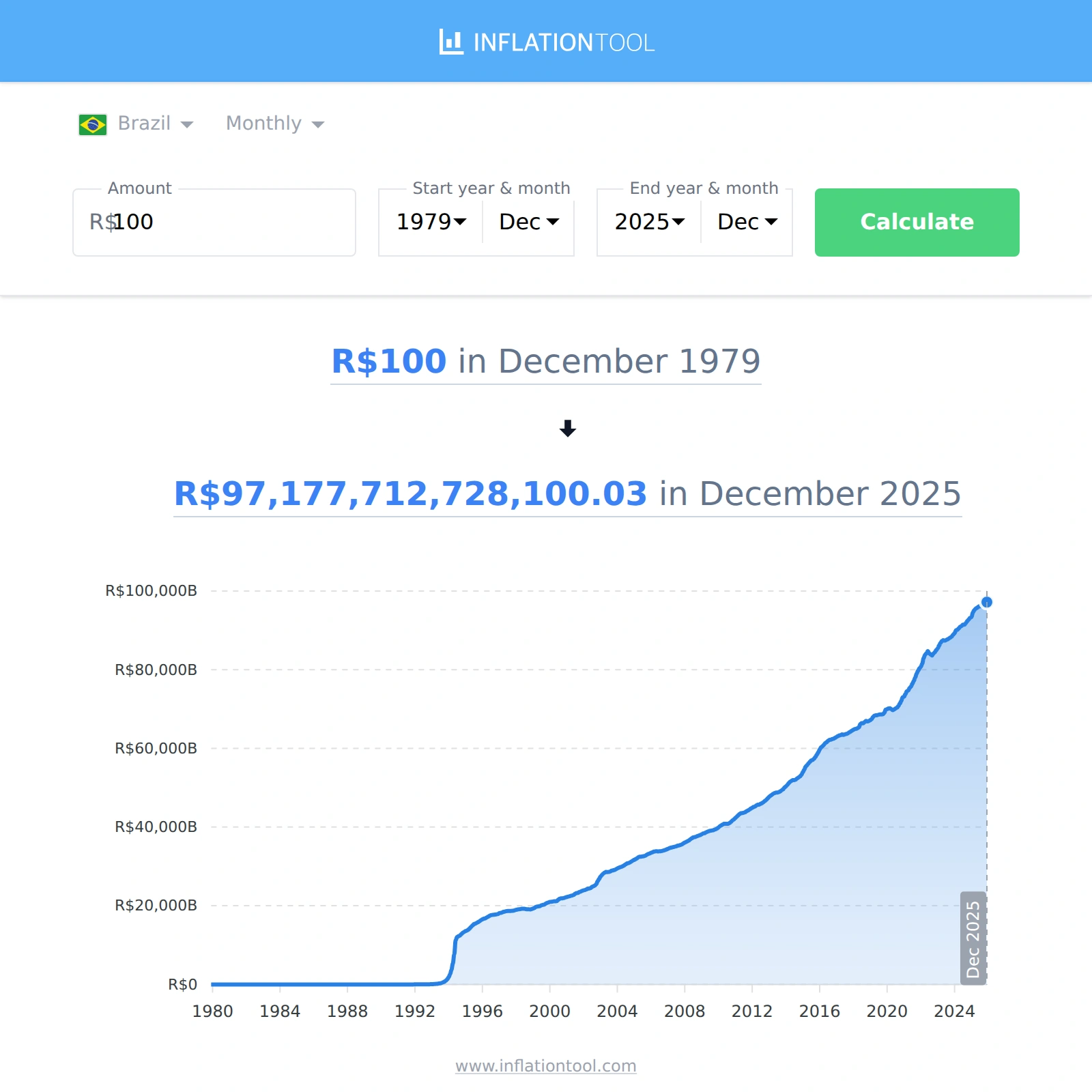 | R$100 reals in 1979-12 | → | R$97,177,712,728,100.05 reals in 2025-12 |