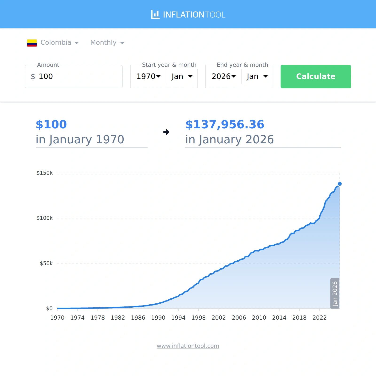 The cumulative inflation rate in Colombia between January 1970 and January 2026 was 137,856.36%, meaning that overall prices were 1,379.6 times higher than they were in January 1970. In other words, the purchasing power of $100 in Jan 1970 was equivalent to $137,956.36 in Jan 2026. The average annual inflation rate over this period was 1.08%.