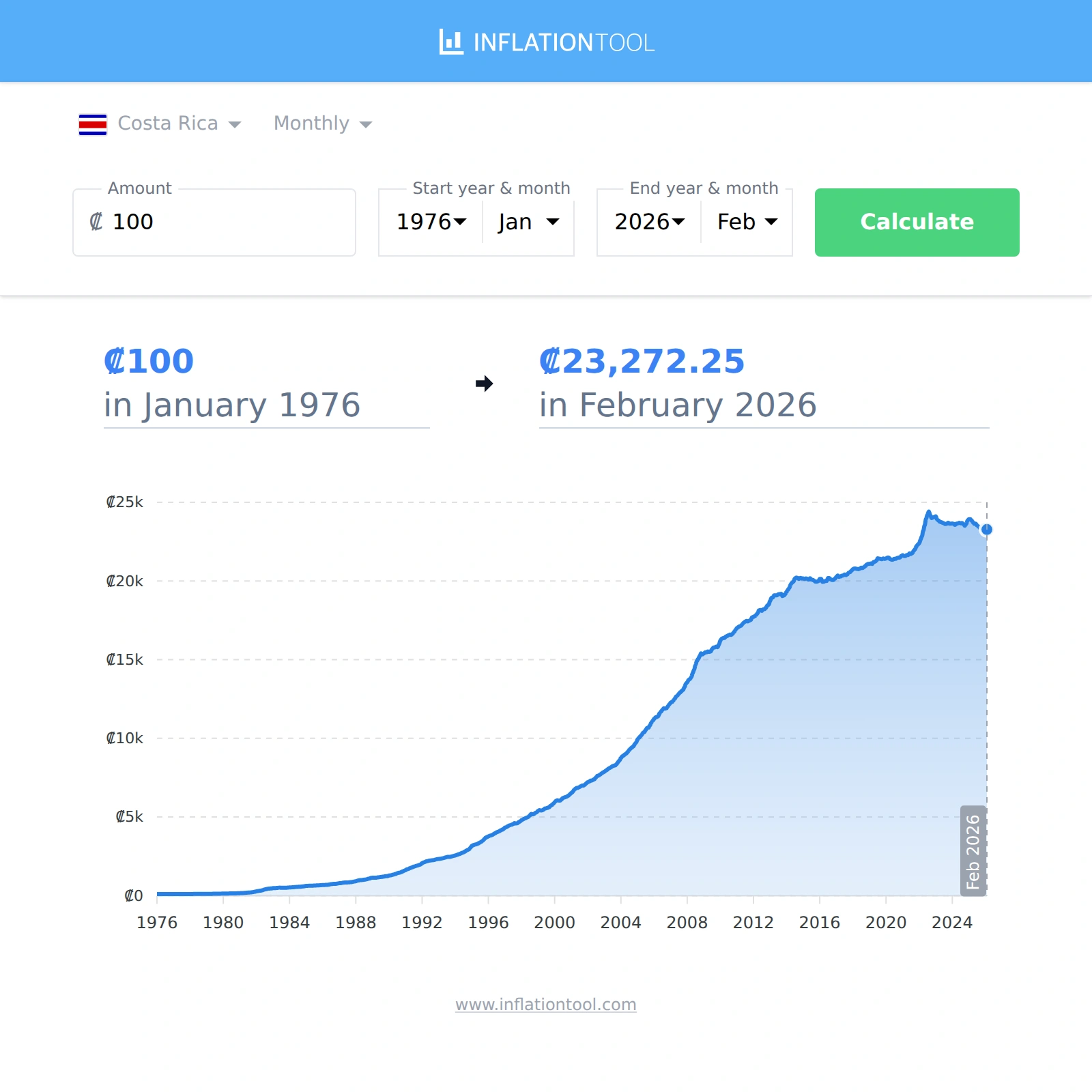 | ₡100,000 colones in 1976-01 | → | ₡23,272,253.24 colones in 2026-02 |