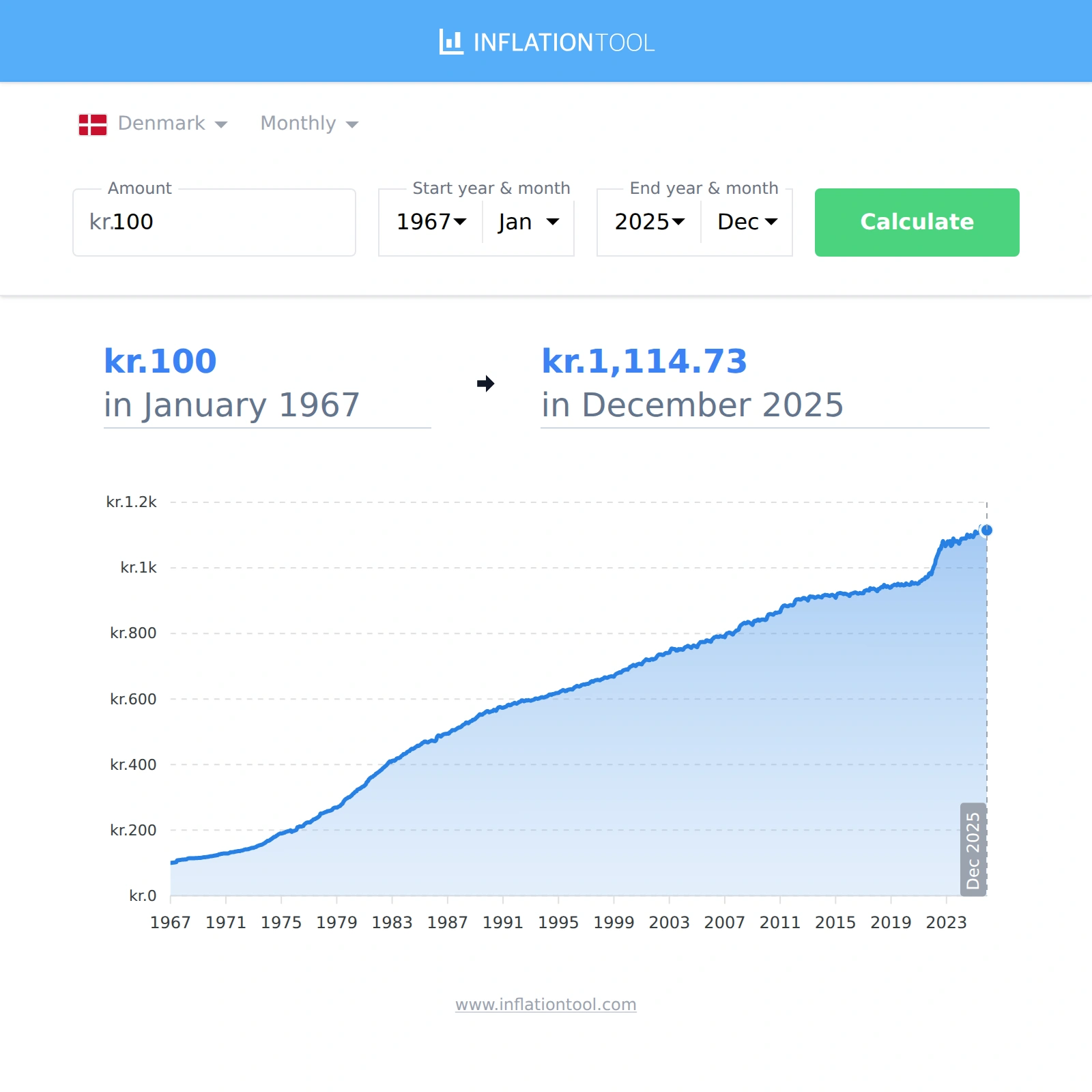 | kr.100 kroner in 1967-01 | → | kr.1,114.73 kroner in 2025-12 |
