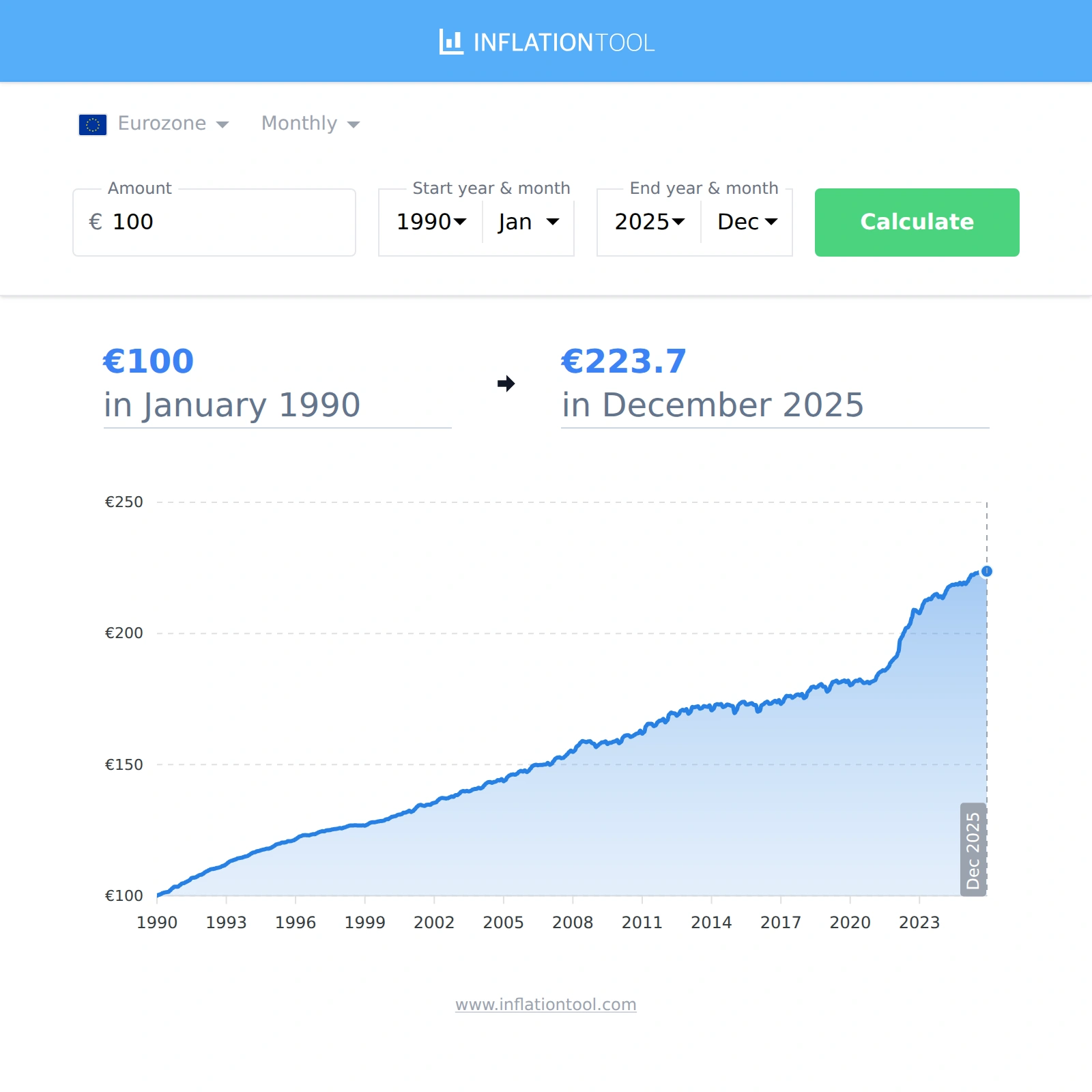 | €100 euro in 1990-01 | → | €223.7 euro in 2025-12 |
