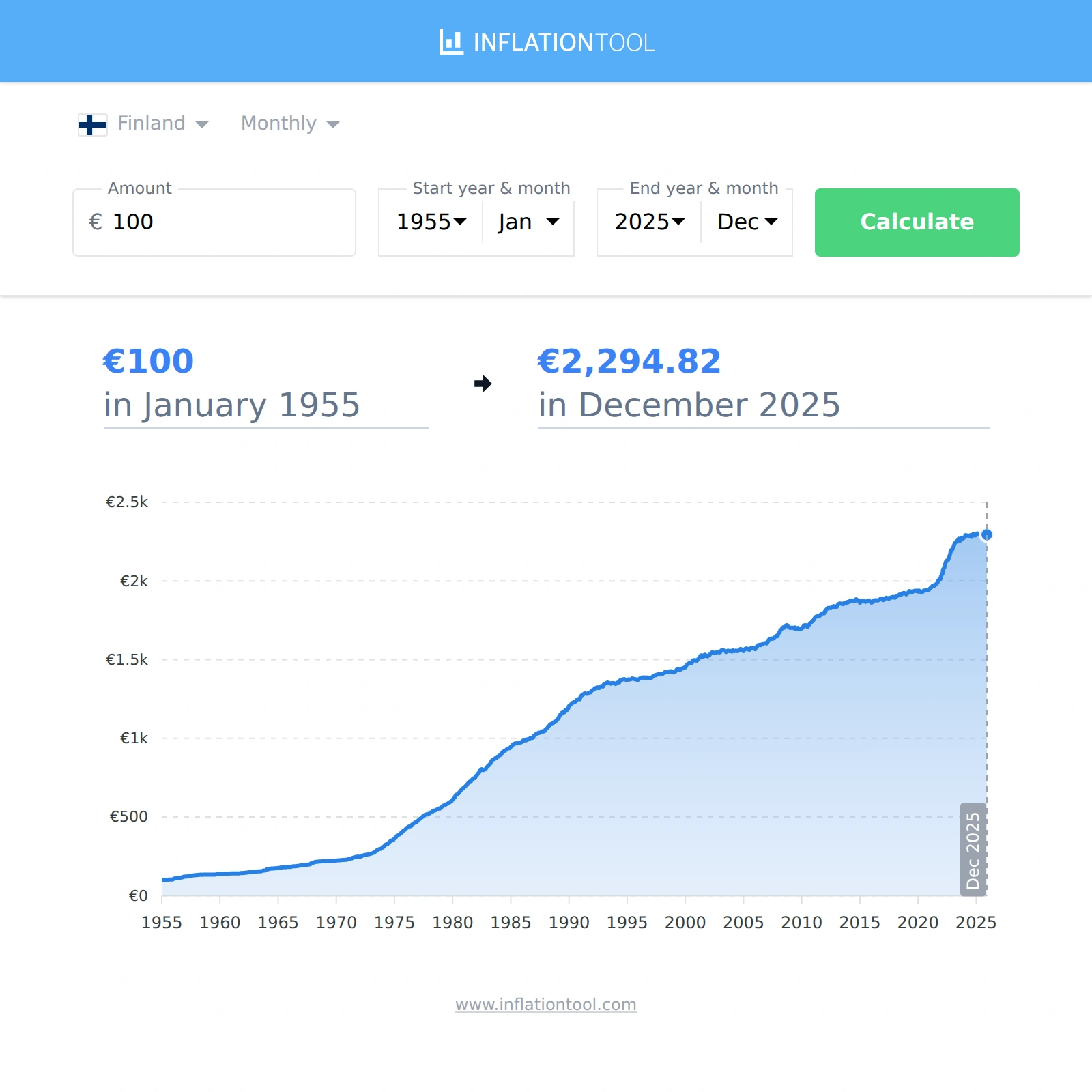 The cumulative inflation rate in Finland between January 1955 and December 2025 was 2,194.82%, meaning that overall prices were 22.9 times higher than they were in January 1955. In other words, the purchasing power of €100 in Jan 1955 was equivalent to €2,294.82 in Dec 2025. The average annual inflation rate over this period was 0.37%.