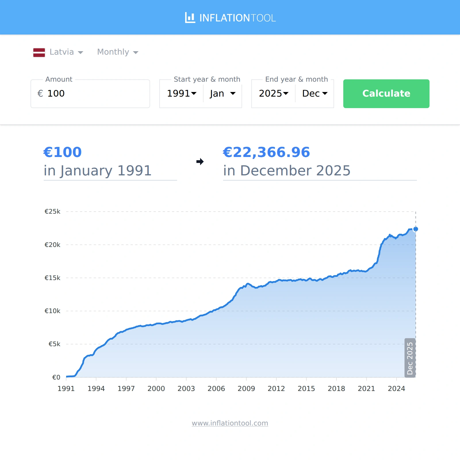 The cumulative inflation rate in Latvia between January 1991 and December 2025 was 22,266.96%, meaning that overall prices were 223.7 times higher than they were in January 1991. In other words, the purchasing power of €100 in Jan 1991 was equivalent to €22,366.96 in Dec 2025. The average annual inflation rate over this period was 1.3%.