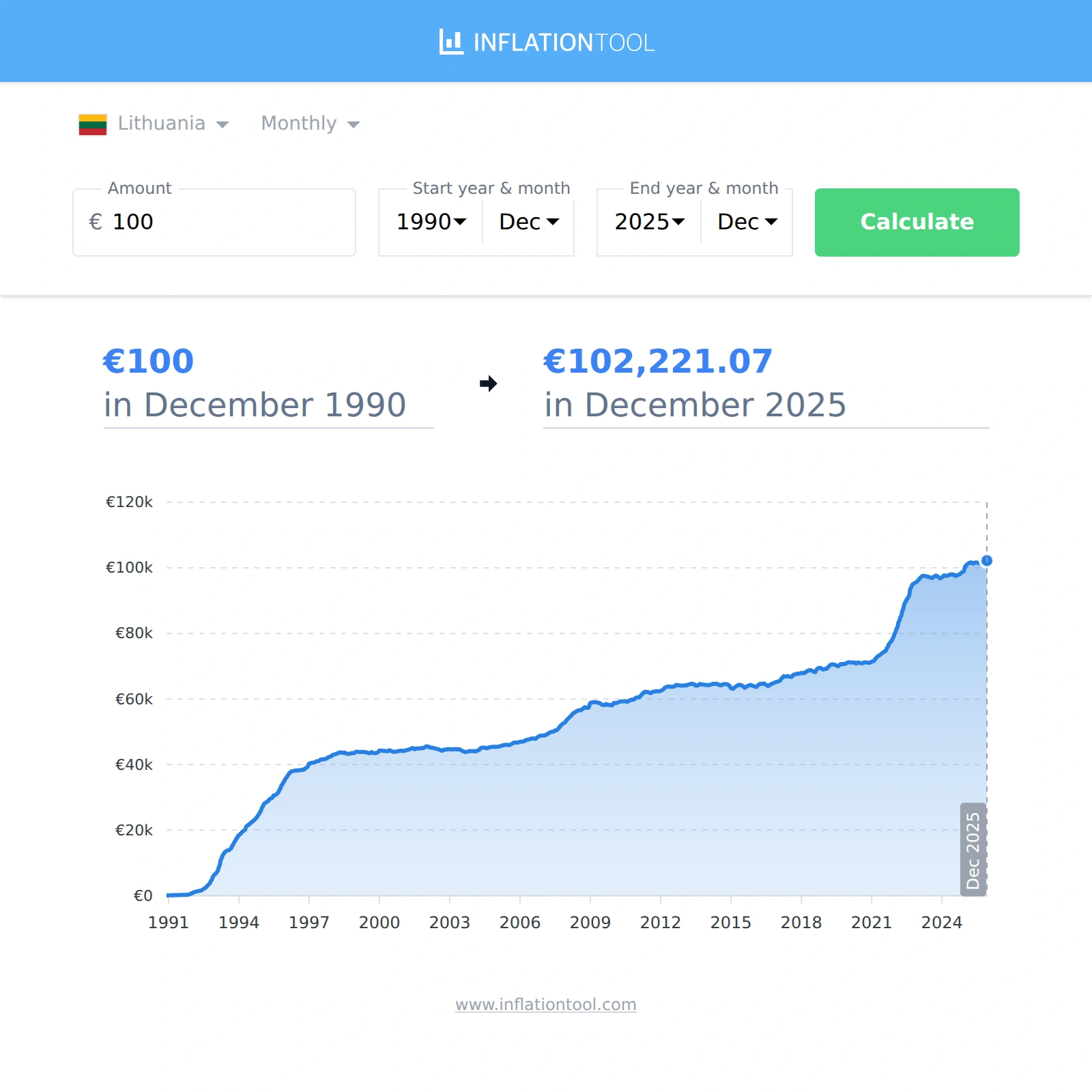 The cumulative inflation rate in Lithuania between December 1990 and December 2025 was 102,121.07%, meaning that overall prices were 1,022.2 times higher than they were in December 1990. In other words, the purchasing power of €100 in Dec 1990 was equivalent to €102,221.07 in Dec 2025. The average annual inflation rate over this period was 1.66%.