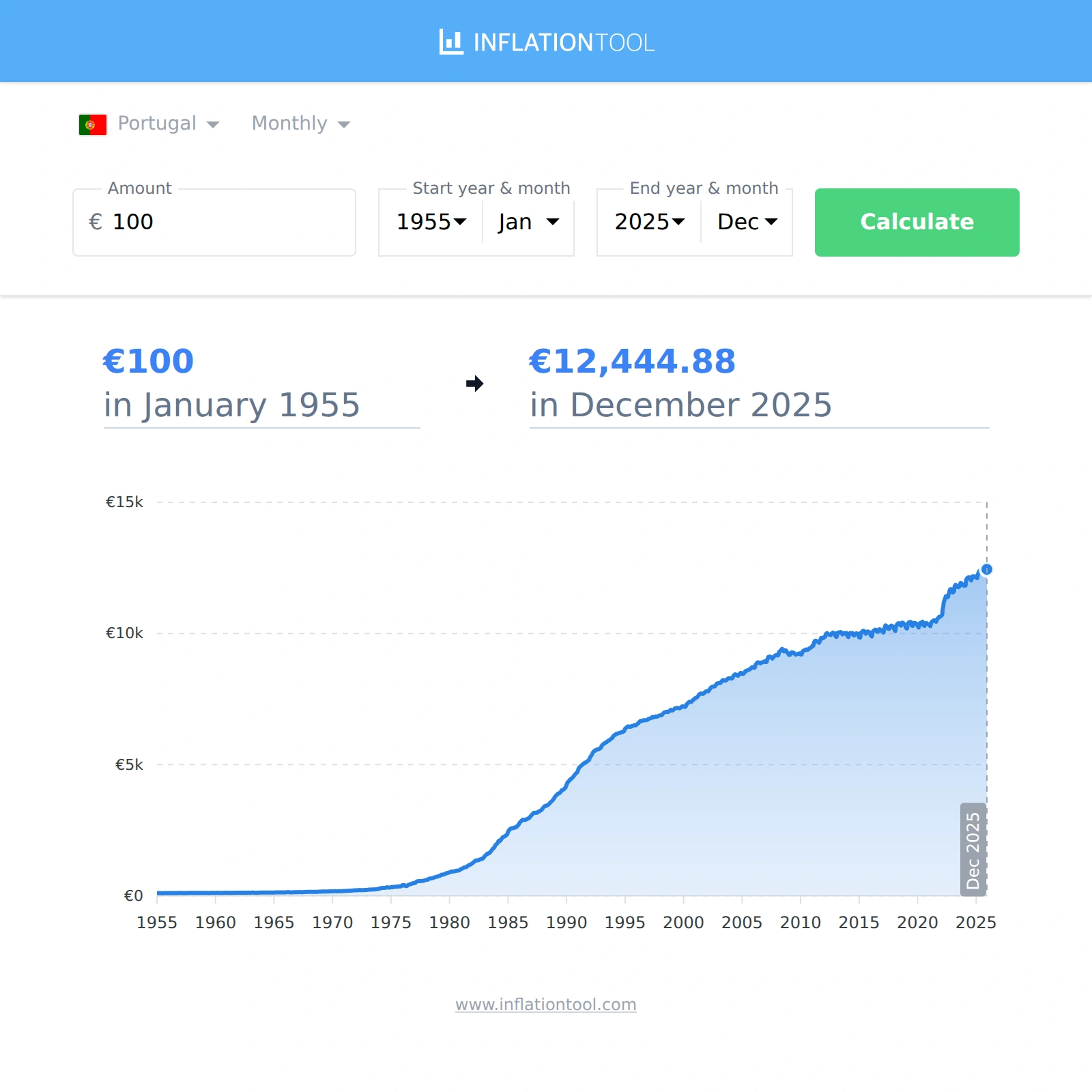 | €100 euro in 1955-01 | → | €12,444.88 euro in 2025-12 |