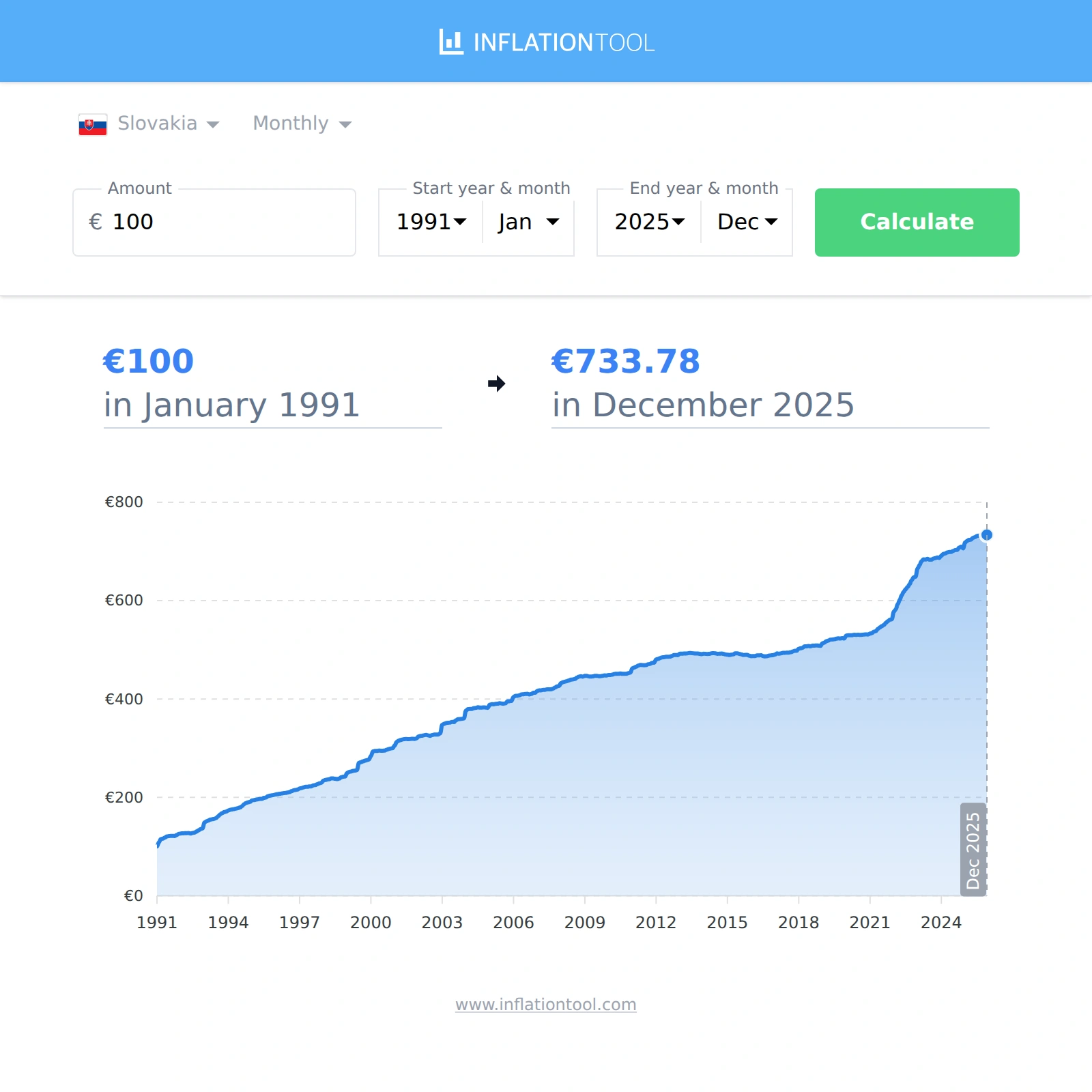 The cumulative inflation rate in Slovakia between January 1991 and December 2025 was 633.78%, meaning that overall prices were 7.34 times higher than they were in January 1991. In other words, the purchasing power of €100 in Jan 1991 was equivalent to €733.78 in Dec 2025. The average annual inflation rate over this period was 0.48%.