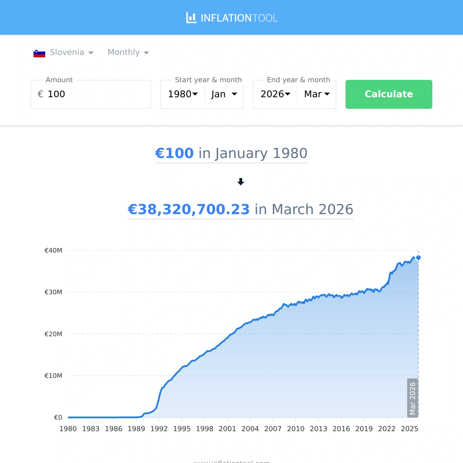 The cumulative inflation rate in Slovenia between January 1980 and March 2026 was 38,320,600.23%, meaning that overall prices were 383,207 times higher than they were in January 1980. In other words, the purchasing power of €100 in Jan 1980 was equivalent to €38,320,700.23 in Mar 2026. The average annual inflation rate over this period was 2.35%.