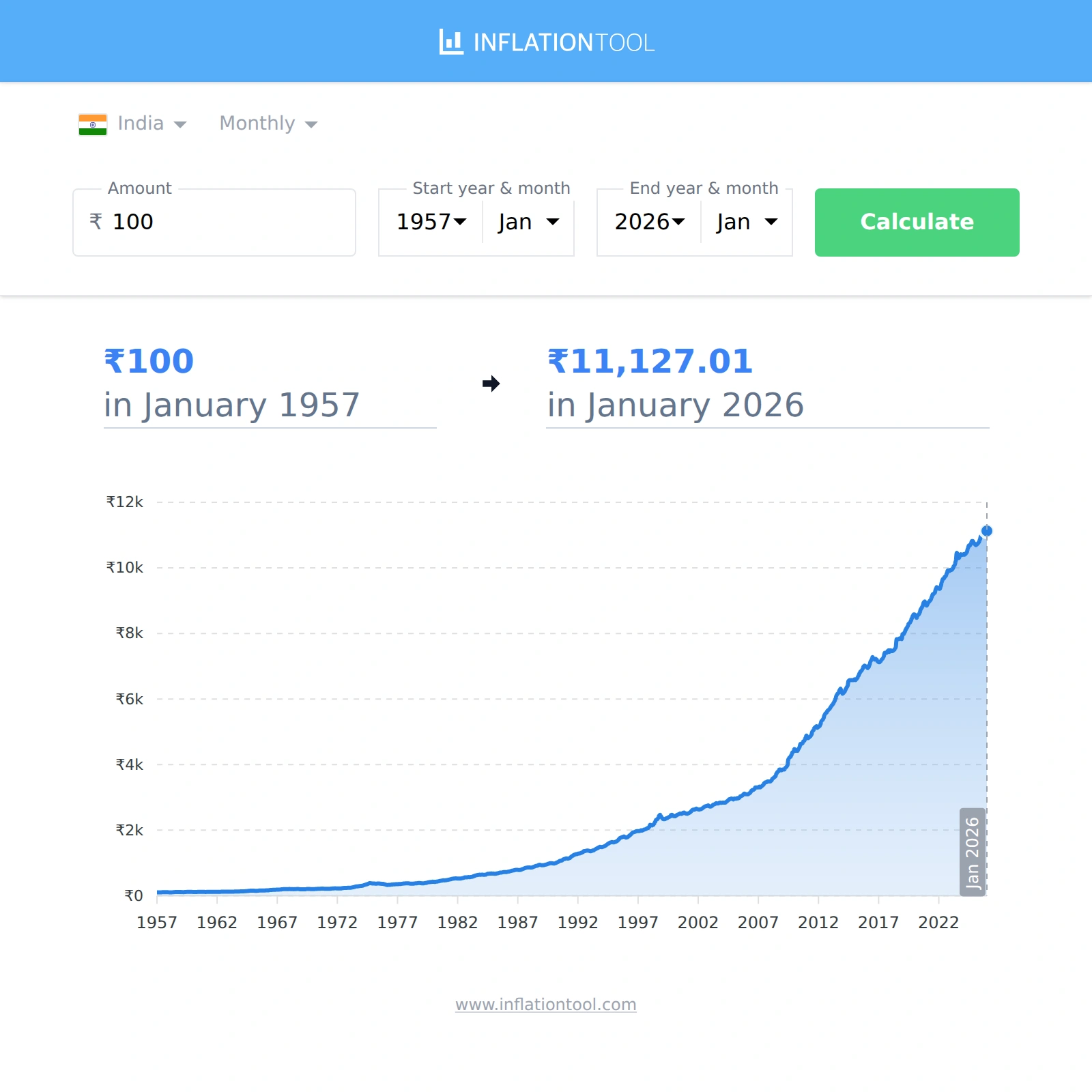| ₹100 rupees in 1957-01 | → | ₹11,127.01 rupees in 2026-01 |