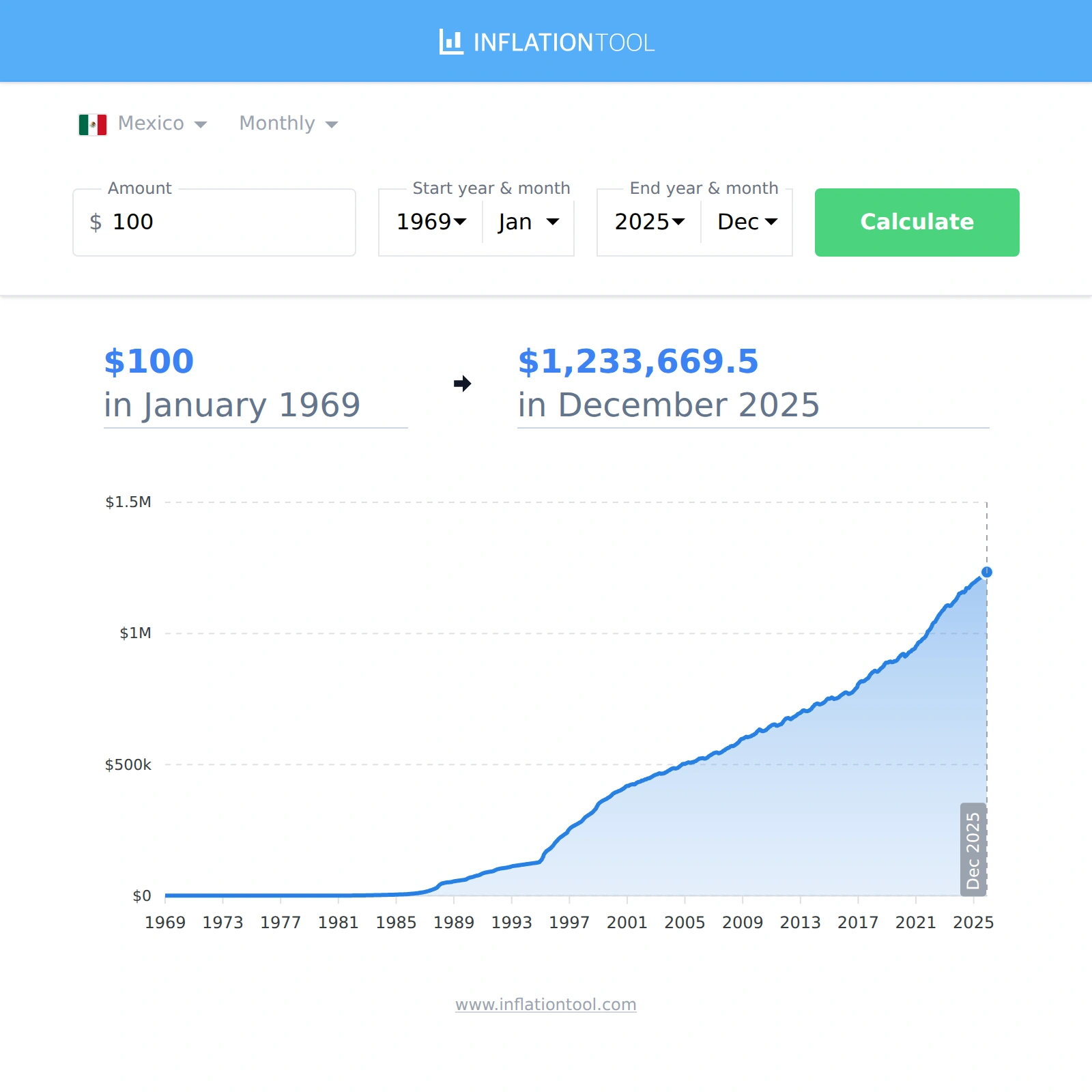 | $100 pesos in 1969-01 | → | $1,233,669.5 pesos in 2025-12 |