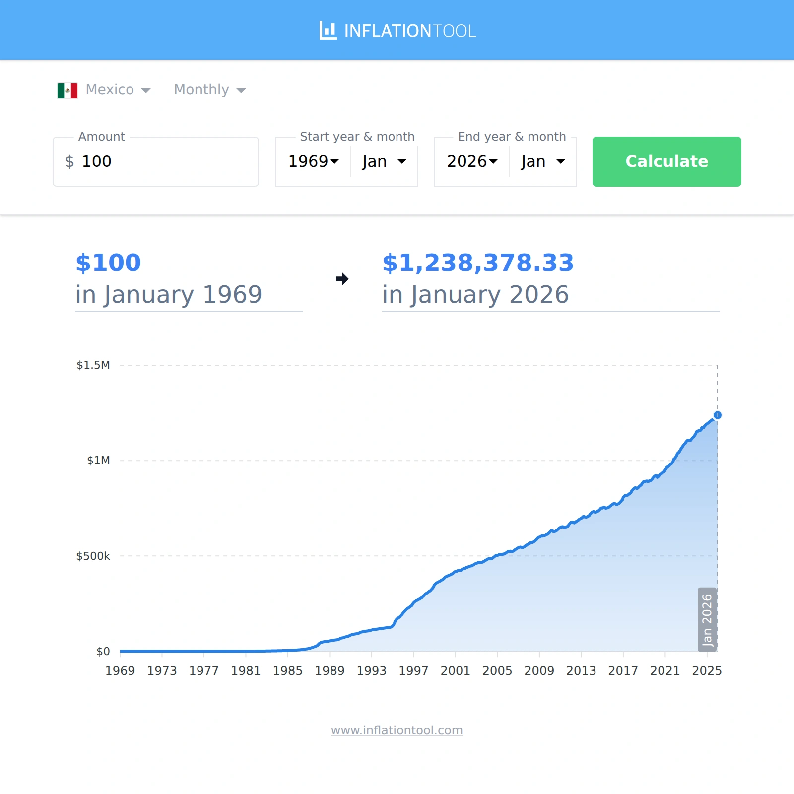 | $100 pesos in 1969-01 | → | $1,238,378.33 pesos in 2026-01 |