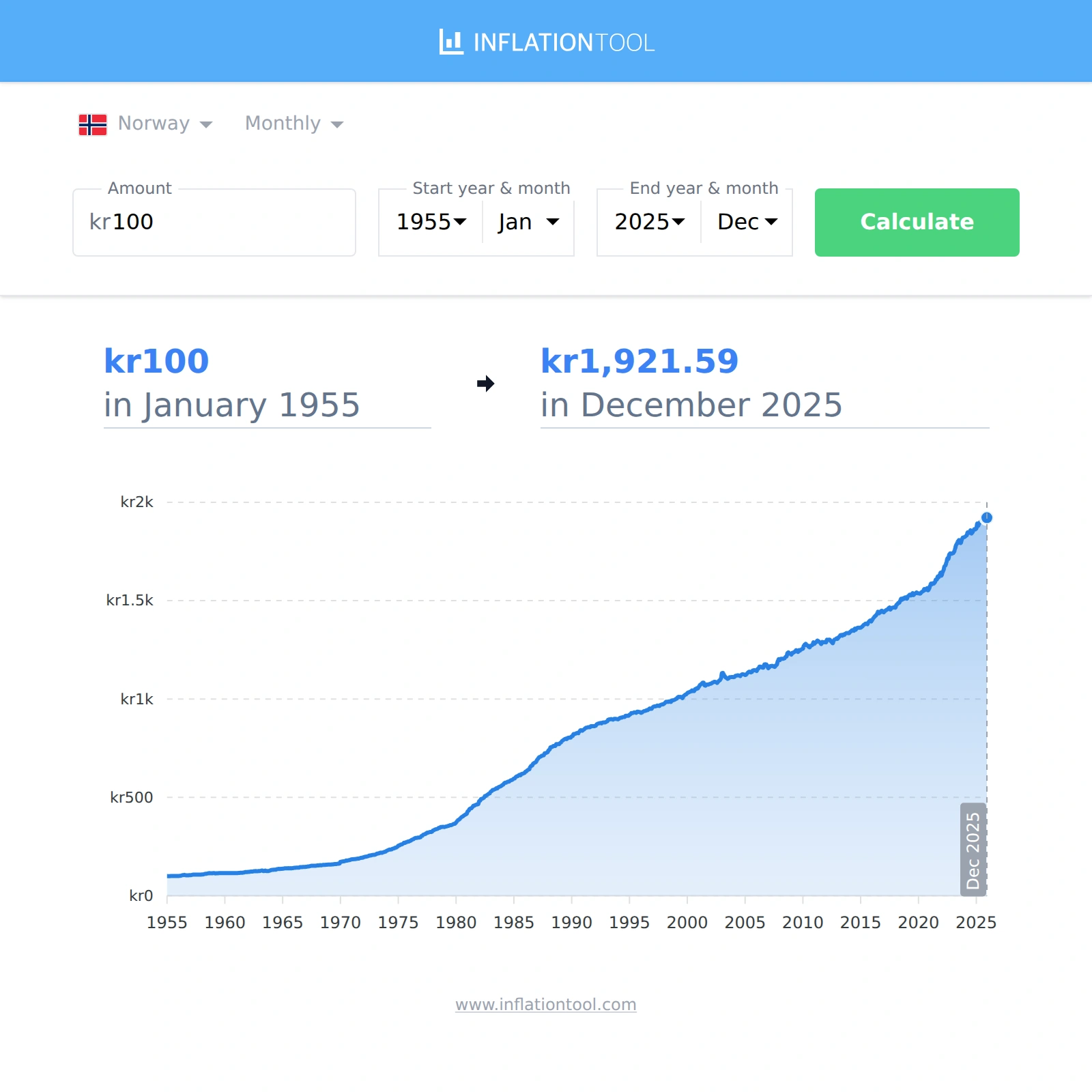 | kr100 kroner in 1955-01 | → | kr1,921.59 kroner in 2025-12 |
