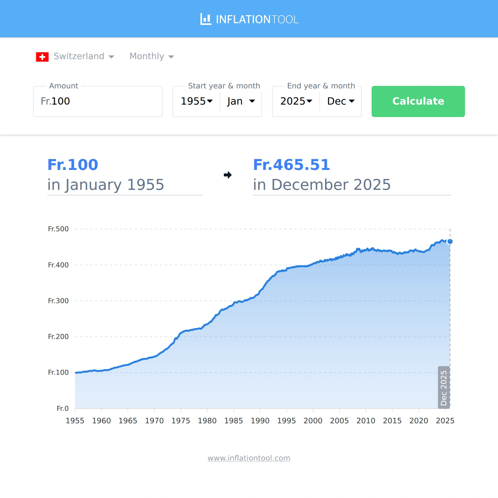 The cumulative inflation rate in Switzerland between January 1955 and December 2025 was 365.51%, meaning that overall prices were 4.66 times higher than they were in January 1955. In other words, the purchasing power of Fr.100 in Jan 1955 was equivalent to Fr.465.51 in Dec 2025. The average annual inflation rate over this period was 0.18%.