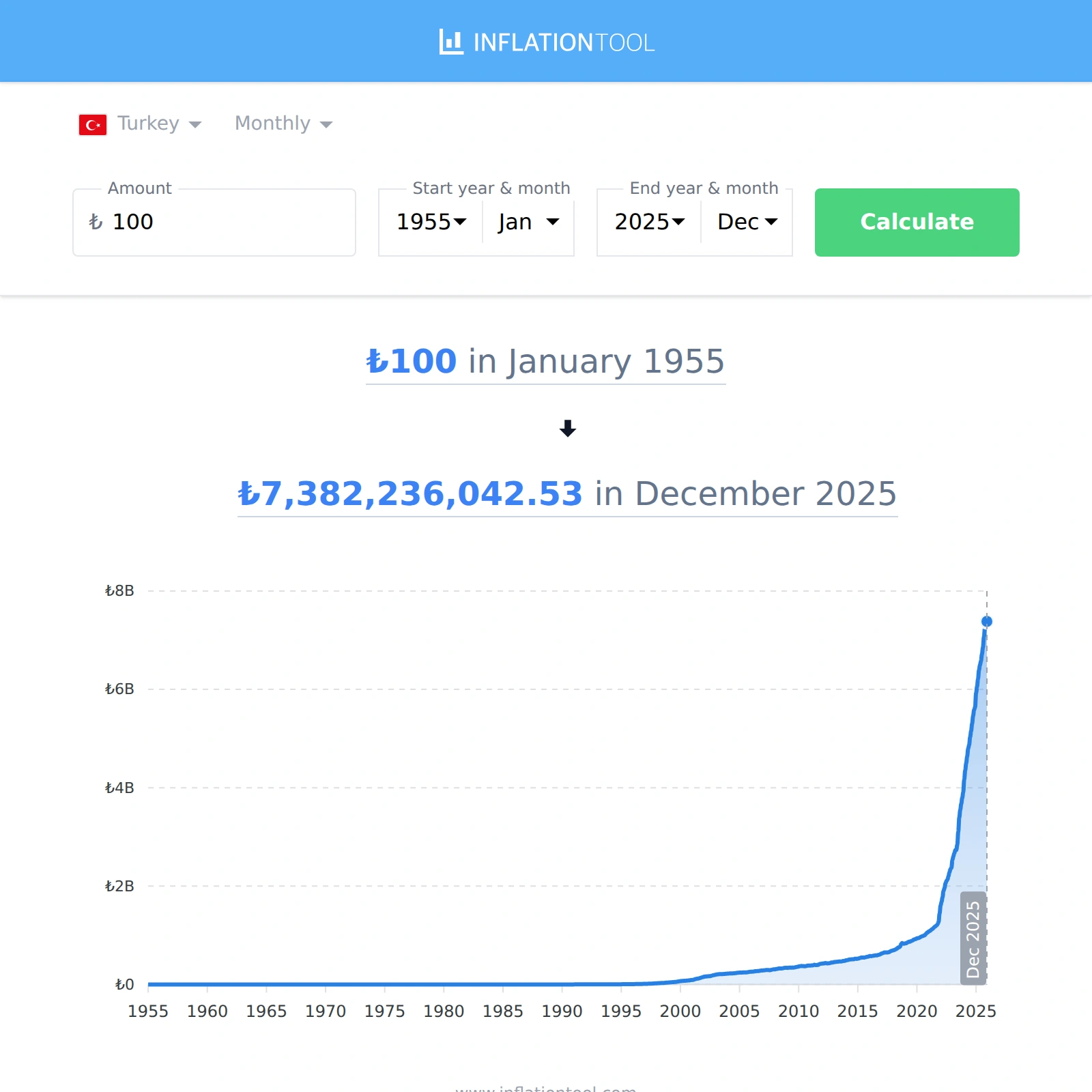 | ₺100 lira in 1955-01 | → | ₺7,382,236,042.53 lira in 2025-12 |